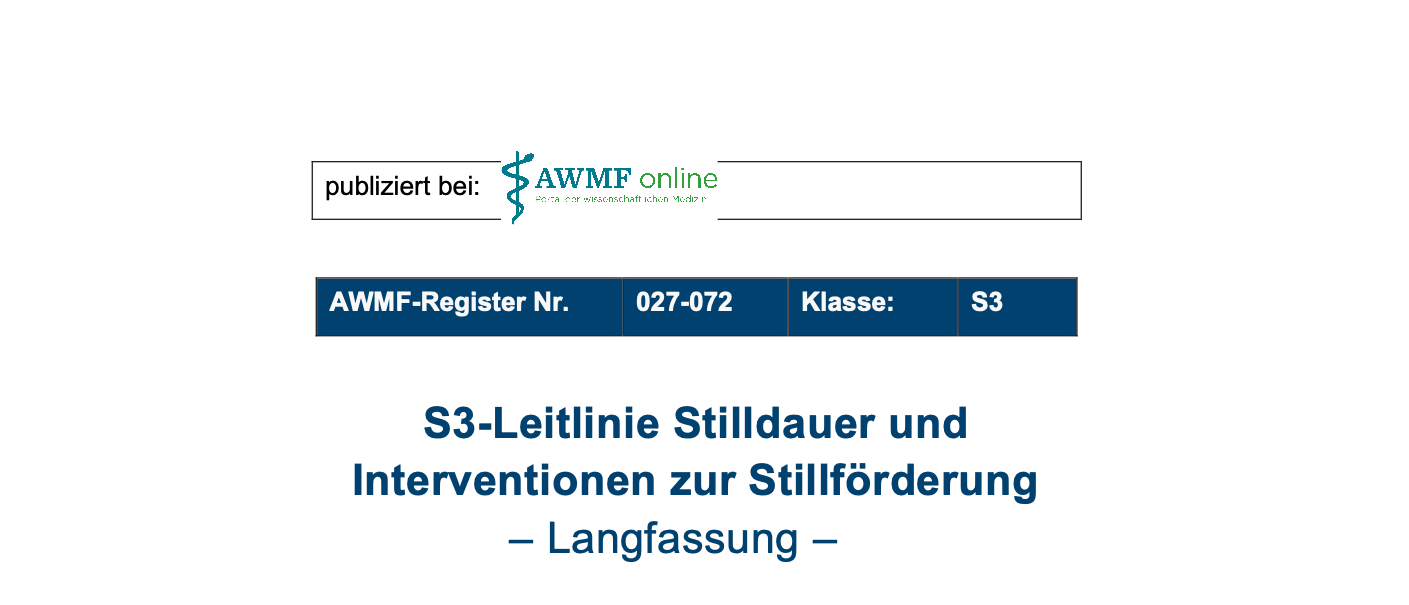 Die neue Leitlinie „Stilldauer und Intervention zur Stillförderung“ wurde von der Arbeitsgemeinschaft der wissenschaftlichen Medizinischen Fachgesellschaften im Februar 2026 veröffentlicht. Die Empfehlungen für die Stilldauer entsprechen dem aktuellen Stand der Wissenschaft. Dabei versteht man unter „ausschließlichem Stillen“, dass keine Flaschennahrung, Flüssigkeiten oder Beikost gefüttert wird. Bei „überwiegenden Stillen“ führt man Flüssigkeiten wie Wasser oder Tee hinzu.